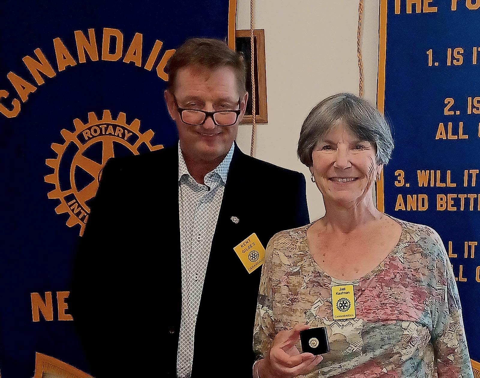 Jody Wilbur (right) becomes a Canandaigua Rotarian