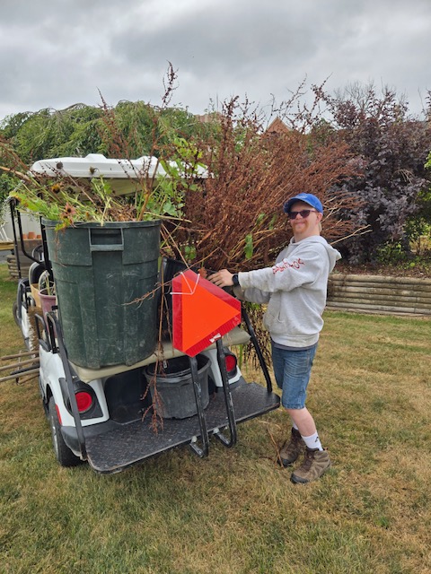 Pictured here is Rotarian, Ben Green, helping load up some of the weeds and deadwood removed from the gardens.