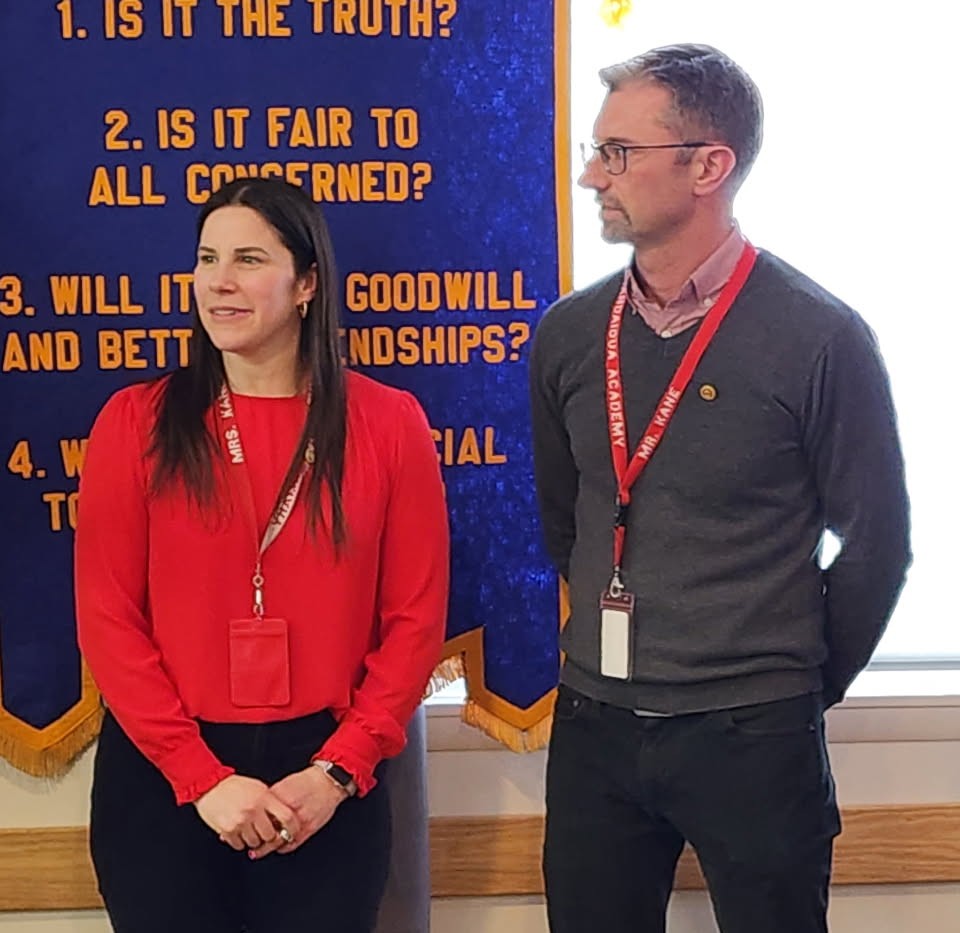 Paul Harris recognition was awarded to Kim and Greg Kane, both of whom are music teachers in the Canandaigua School District. Kim teaches music at the Primary School and Greg at Canandaigua Academy. They were recognized for the outstanding dedication they both have demonstrated to enriching students lives through music.
