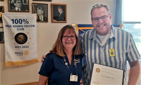 Gareth Evans received his Paul Harris pin from Club President Marty Potter.