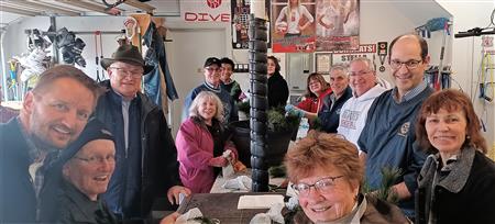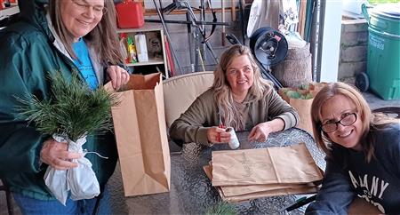 Club members gathered in Greg Gullo's garage to assemble seedlings with mulch and bag for 1st grade students.