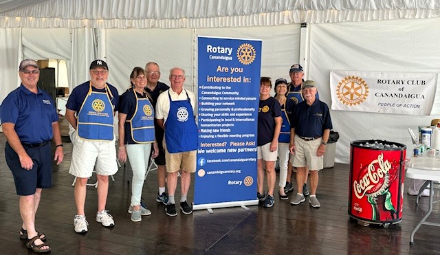 Rotarians cooked up a storm on July 20th at Sonnenberg's Arts in the Garden. Pictured are President Kim Tenreiro with Rotarians Curt Bailey, Margie LaTourette, Clark Kurtz, Dick McGavern, Marty Potter, Kathi Nevin, Rick Hawks, and Rick Lassard.