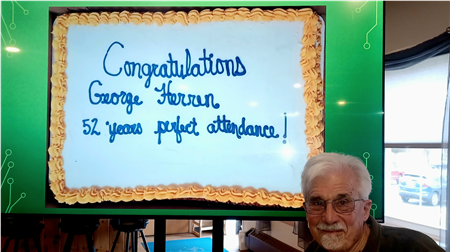 George achieved 52 years of Perfect Attendance. George said “It has been as exciting, challenging, and rewarding as his sky dive on his 90th birthday last September.”