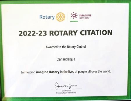 The Canandaigua Rotary Club received a citation from Rotary International for meeting at least 13 of its goals. The goals included but not limited to donate money to RI Foundation, projects that were completed, volunteer hours etc. 2022-23 Club President Marty Potter said that the citation really goes to the members since many helped. Significantly, the citation was signed by Jennifer Jones, the 1st female RI President.